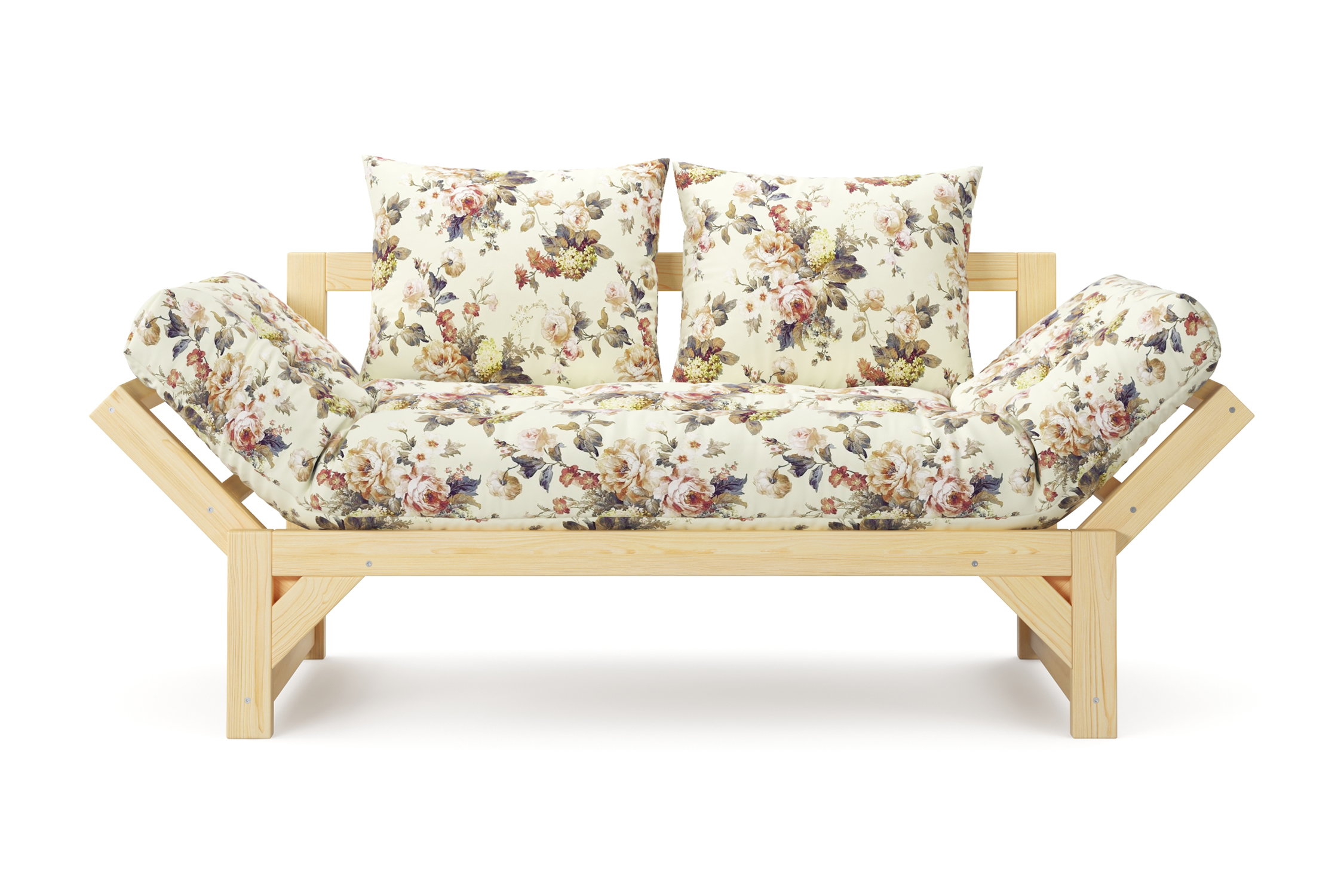 Максимальная нагрузка — 220кг. Ширина деревянной спинки 130 см. Приспинные подушки, представленные на фото, входят в комплект. Декоративные приобретаются отдельно. Диван продается без лакокрасочного покрытия, под самостоятельную покраску. Высота сиденья без матраса - 31 см, с матрасом 46 см.