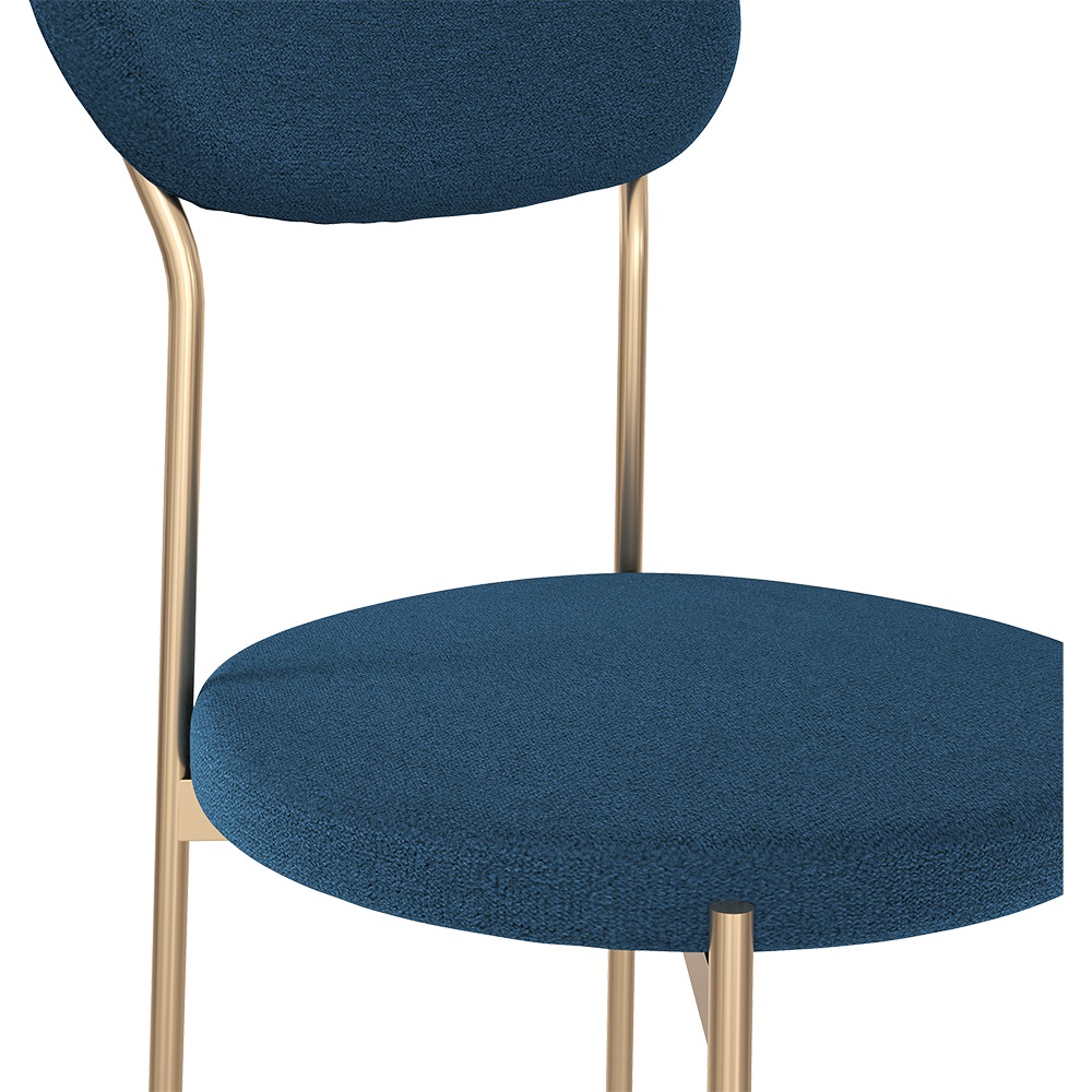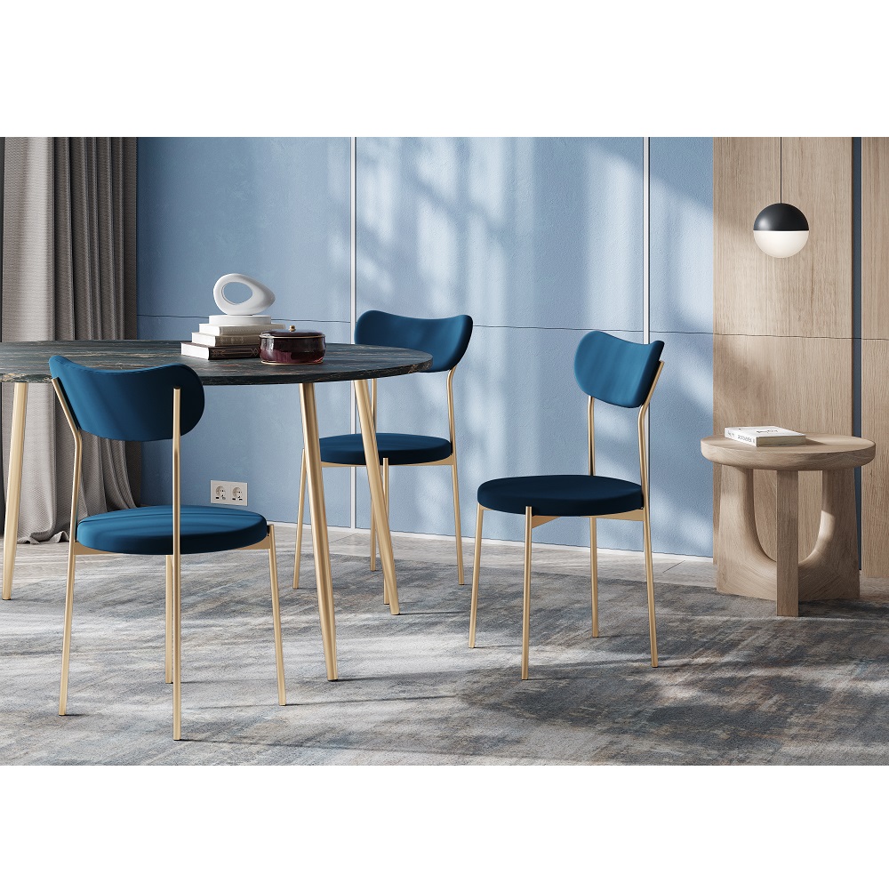 Удобный кухонный стиль в современном стиле. Округлая сидушка и спинка правильной формы обиты прочным и приятным на ощупь велюром синего цвета. Опоры золотые. В комплекте 2 стула.