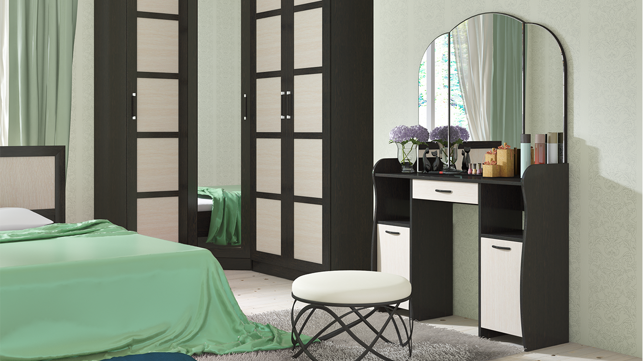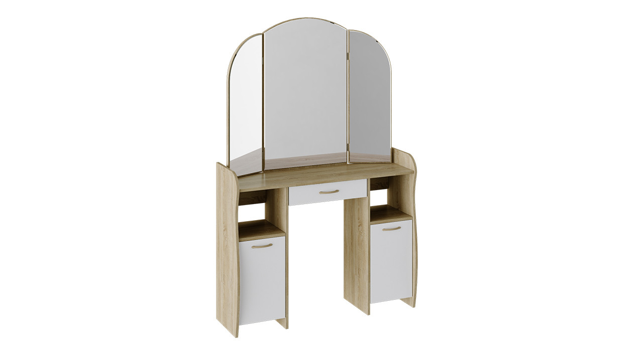 Лаконично простой и элегантный туалетный столик обладает не только эстетичным видом, но и достойной практичностью. Модель отличается эргономичной конструкцией и элегантной формой деталей. Вместительный ящик, столешница, большое зеркало и полки расположены на удобном уровне. Использование двух цветов в дизайне модели делает её оригинальной и позволяет использовать в любом интерьере.